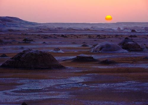 沙漠里只有天的藍(lán)與沙的黃,大地仿佛披上了藍(lán)黃相間的外衣。繼續(xù)前行,眼前的色彩逐漸變幻,由藍(lán)黃交錯(cuò)變?yōu)楹诎追置。黑沙漠頗有大峽谷的風(fēng)范,氣勢(shì)恢宏,雄偉蒼涼;白沙漠令人仿佛置身雪地,風(fēng)化后的巖石形狀各異,在夕陽(yáng)下爭(zhēng)妍斗麗。日落時(shí)分,黑白沙漠深邃而蒼勁,震撼心靈。