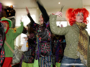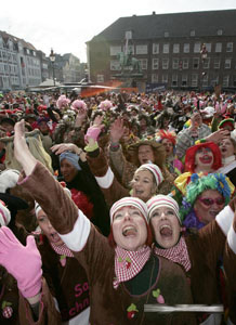 今年的“女人狂歡節(jié)”是2月19號(周四),這一天成千上萬的“女狂人們”涌上街頭狩獵男人們的領帶,并吹響了“奪權”的號角。萊茵地區(qū)是這個瘋狂節(jié)日的“主戰(zhàn)場”。杜塞爾多夫的女狂人們不顧嚴寒料峭沖上了市政廳廣場,要在11點11分準時讓市長迪爾克·埃爾博斯(dirk elbers)繳械投降。波恩-博伊爾區(qū)的瘋狂“洗衣婦”們則在“洗衣公主”克里斯汀娜一世(wäscherprinzessin christine Ι.)的率領下攻占了市政廳。說到“洗衣婦”,她們可是大有來頭的。波恩是萊茵地區(qū)女人狂歡節(jié)的發(fā)源地:早在1824年在博伊爾區(qū)從事洗衣工作的婦女中就有了這樣的風俗——一年一度逼迫男人交出權力以及表達對不堪重負的體力勞動的反抗。在特里爾,10點11分的時候無數(shù)的瘋狂女人就已經(jīng)沖破了“城市衛(wèi)隊”的堅固防守闖入了市政廳。在科隆,“三人執(zhí)政團”(dreigestirn)以倒數(shù)11點11分的方式宣布街頭狂歡正式拉開帷幕。而在亞琛,女狂人們也占領了集市廣場,瘋狂慶祝她們的勝利“奪權”,集市上懸掛的禁酒令絲毫沒有破壞到狂歡的節(jié)日氣氛。