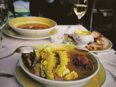 馬賽最有名的菜首推馬賽魚湯(bouillabaisse)。它是用番茄、土豆和海產(chǎn)魚貝熬制很久的濃湯,配上涂上蒜泥蛋黃醬的小面包片,原本是漁民的妻子為了給下海的丈夫暖和身子,以賣剩的魚熬成的平民湯菜,如今已成為各個階層都熱衷品嘗的美味。每份12-14歐元,價格略有些高,但份量很足。 舊港沿街餐廳的魚湯非常有名,但對旅行者不夠誠實(shí)。la daurade是一家頗受人們稱贊的餐廳,它背對卡農(nóng)維爾街,從quai de rive neuve左拐第一街進(jìn)去的st-saens路的右側(cè)即是。