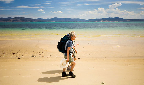 “希望到夏天的時候,這兒的海水會暖和一些!碑(dāng)我們著海水登上塔斯馬尼亞的瑪麗耶阿島時,我忍不住喊道!艾F(xiàn)在就是夏天!币晃煌械娜颂嵝盐艺f。我們7個人從船上出發(fā),穿過淺水區(qū),登上了寬闊的沙灘。海岸線呈弧形向兩頭延伸開去;由蔥郁的灌木叢和遠(yuǎn)處泛著微光的海岬所勾勒出的沙灘,在正午的陽光下閃閃發(fā)光,近乎純白。放眼望去,看不到任何建筑,這是一片處女海灘,沙灘上只有三四個人。我們跟隨3個見聞廣博的年輕塔斯馬尼亞婦女——納塔尼亞、哈尼和梅德琳朝著第一個宿營地進(jìn)發(fā)。