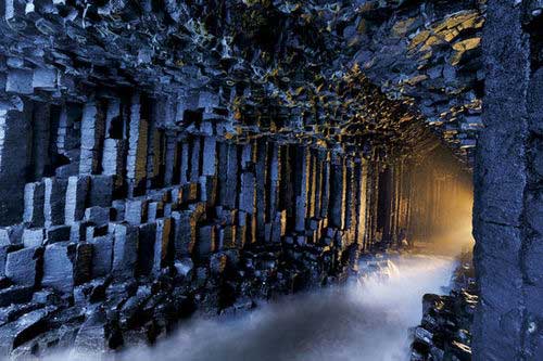 海底洞穴的玄武巖石柱依次排列,燈光來自攝影師。芬戈?duì)柖囱ㄓ捎谑帕械淖匀痪群筒ɡ伺拇蚝0兜幕匾簦?8世紀(jì)后期吸引了無數(shù)的游人。
