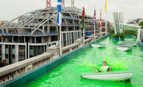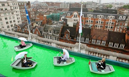 該屋頂人工島和人工湖,除了使用數(shù)英里長(zhǎng)的鋼鐵加固屋頂、搬來(lái)數(shù)千植物、灌入大量染成明亮薄荷綠的水之外,還配備了12艘最多可承載2人的迷你小船,游客可以一邊劃船乘涼,一邊俯瞰倫敦高低起伏的建筑景觀,別有一番韻味。在劃船之余,還能在現(xiàn)場(chǎng)開(kāi)設(shè)的一個(gè)雞尾酒吧聊天喝酒、試吃新產(chǎn)品。甚至專門設(shè)有一名救生員,有人不慎從船上跌下水也不用擔(dān)心。