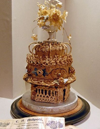 這個(gè)蛋糕制作于1898年,當(dāng)時(shí)正是維多利亞女王當(dāng)政時(shí)期,蛋糕上面裝飾著糖果蜜餞,糖衣外殼在二戰(zhàn)時(shí)期被炸彈炸出一條裂縫。這個(gè)已經(jīng)擁有113年歷史的蛋糕,最初曾在漢普郡一家面包店窗口處展覽,這家小店于1964年關(guān)門。隨后這個(gè)蛋糕被送到一個(gè)閣樓上保存,直到面包師的女兒在生命即將走到盡頭時(shí)將其捐贈(zèng)給當(dāng)?shù)匾患也┪镳^。