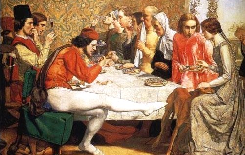 例如米萊斯1849年的《羅蘭茨與伊莎貝拉》就是很典型的拉斐爾前派作品,描繪的是詩(shī)人濟(jì)慈的作品,富家小姐伊莎貝拉和羅蘭茨相愛,卻受到她兄長(zhǎng)的反對(duì),因此在畫面中,餐桌上的不少人用各種姿態(tài)表現(xiàn)出輕蔑,而羅蘭茨則向伊莎貝拉獻(xiàn)上橘子,神情專注真摯。