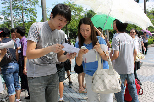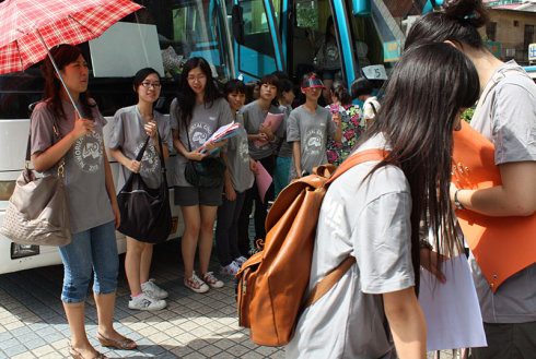 老師們一大清早就聚集在廣州黃花崗劇院門前迎接家長和學生們。學生首先簽到,然后上車,等車上滿人的時候就開往番禺校區(qū)。車輛就這樣來來回回跑了十幾趟,最后在11點左右終于把所有的學生送到番禺營地。