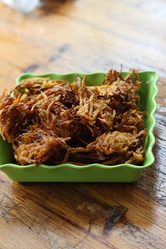 這是南瓜混合了面粉油爆的,一朵一朵,像菊花叻!配上綠色的花邊塑料碗,不管吃相賣相都極好,咬一口酥酥甜甜,我大愛。
