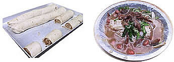 豬腸粉。選用存放半年的大米,磨成漿,蒸制成薄塊,卷圓呈豬腸狀。調(diào)料用咸甜醬,用紅糖塊切片,加水后配少許食鹽、陳皮粉、八角粉,慢火勻煮數(shù)小時即成,再用當(dāng)?shù)蒯劤傻拿拙拼住⑺庀、熟花生油配入炸蝦饃、炸花生米、炸蝦米、烤豬肉、蔥花。食用時,將腸粉切成小節(jié),置在碗中,依次加入上述調(diào)料和配料適量,拌勻而食,五味調(diào)和,香滑可口。