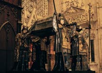 哥倫布的靈柩1898年由古巴運(yùn)回西班牙后,埋葬在教堂中的哥倫布墓。石棺上有西班牙四古國(guó)——卡斯蒂爾、萊昂、納瓦拉、阿拉貢的騎士抬起哥倫布靈柩的雕像。