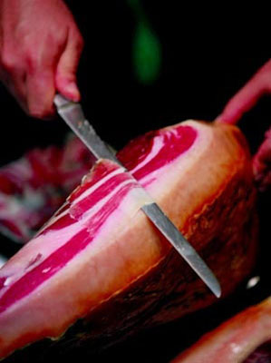如果要選西班牙最流行或者最昂貴的一種食物,那一定是伊比利亞火腿。這種火腿類似陽澄湖大閘蟹,受到極其嚴格的原產(chǎn)地認證和保護,是用西班牙最接近野豬的品種--伊比利亞黑蹄豬制成。這種豬自小在指定山區(qū)自然放養(yǎng),吃野生的橡果長大,產(chǎn)量極其有限,加上用天然的海鹽腌制,在西班牙南部獨特的地中海和大西洋交界處的氣候下風(fēng)干成熟,純天然且?guī)в邢鸸娘L(fēng)味,越陳越好吃,令西班牙人為之著迷了好幾個世紀,走到哪里都可以看到火腿高懸的身影。用特制長刀切下薄薄的一片來,瘦肉緋紅半透明,中間均勻布滿了如同和牛大理石花紋一樣甘美的脂肪,用拇指和食指抓起來整個放到嘴里,在口中化開如同一個飽滿的親吻。