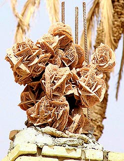 在突尼斯的撒哈拉沙漠深處,出產(chǎn)一種美麗的石頭沙漠玫瑰。這是一種石膏類晶體,長(zhǎng)短不齊,從花心中伸展出一層層花瓣,狀如盛開的玫瑰,因此得名。