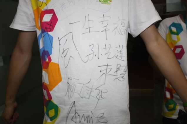 想起昨晚結(jié)營晚會結(jié)束后,高中和初中詞匯營的酷酷們久久不肯離開教室和老師辦公室,找老師們簽名的場景,就想把大家昨晚的營服涂鴉照也傳上來,以作留念和回味?峥岷⒆觽儯佑!
