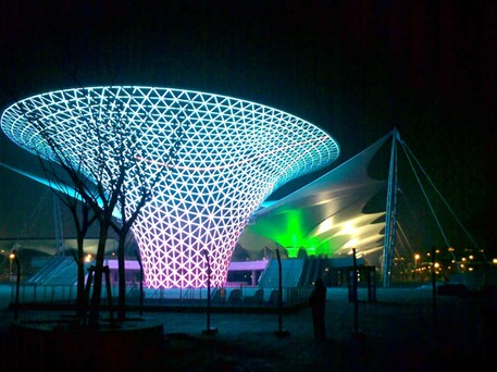 上海世博園區(qū)分為數(shù)個片區(qū),世博會期間擁有一軸四館和11個聯(lián)合館、42個租賃館、42個國家自建館等。而現(xiàn)在保留的則包含一軸四館與沙特館等國家館。一軸四館包括世博軸、中國國家館、世博會主題館、世博中心和世博會演藝中心。世博軸在+10.0米平臺上有大型張拉膜結(jié)構(gòu)頂蓋和輕型鋼結(jié)構(gòu)陽光谷。