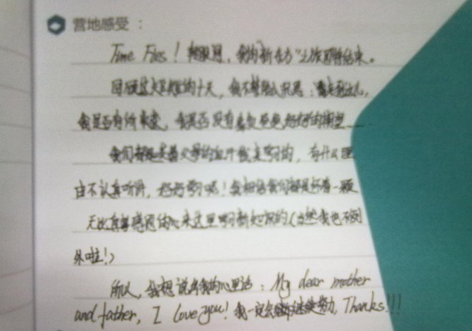 轉(zhuǎn)眼間,營(yíng)地的生活已經(jīng)接近尾聲,同學(xué)們馬上要回到父母身邊,這十天對(duì)于同學(xué)們來(lái)說也許是痛并快樂著的十天,每天的晚間活動(dòng)豐富同學(xué)們營(yíng)地生活的同時(shí)也讓人感慨,時(shí)間過得如此之快,而對(duì)于在家的父母來(lái)說這十天卻是相當(dāng)?shù)穆L(zhǎng)。父母賜予我們生命,我們最應(yīng)感恩的就是把我們帶到這個(gè)世界上來(lái)的父母。在營(yíng)地生活的尾聲,詞匯營(yíng)的同學(xué)們以“感恩父母”為主題,用日志記錄下對(duì)父母深深的愛。