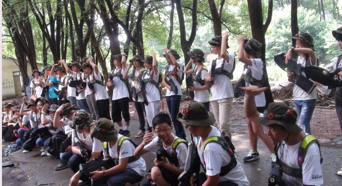 總共有四十名學(xué)生參與到“戰(zhàn)斗”中,分為“警察”和“恐怖主義分子”兩組。我們的比賽規(guī)則是若一方擊斃另一方人數(shù)達(dá)到百分之八十,同時(shí),若警方無法在三十分鐘內(nèi)救出人質(zhì)則警方落敗,恐怖主義份子獲勝。