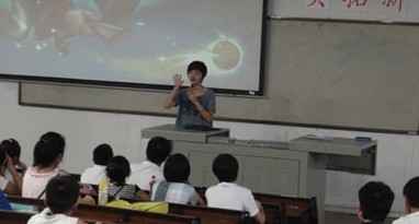 在課堂上,老師利用多媒體設(shè)備生動幽默的向?qū)W生傳授知識。外教課上,來自英國的外教老師親切的和學生交談著。