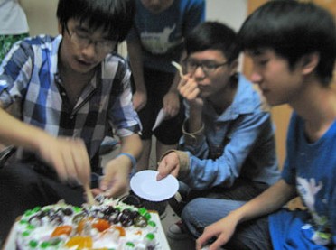 五分鐘過后,助教長張老師帶著卜易回寢室敲門,據(jù)說要填寫表格。門開了,突然顯現(xiàn)了微弱的蠟燭燈光,床上掛滿了氣球,一首《happy birthday》唱響了整層樓,靦腆的小男生在蛋糕前許下了自己15歲的生日愿望!歡呼聲結束大家開始分蛋糕嘍!