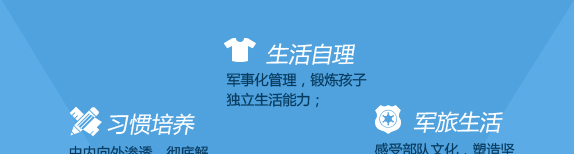 軍事訓(xùn)練+行為習(xí)慣訓(xùn)練:通過軍事化的行為訓(xùn)練,由外向內(nèi)滲透,徹底解決內(nèi)心不良根源,達(dá)到身心合一,想到就可以做到,從而達(dá)到自律
